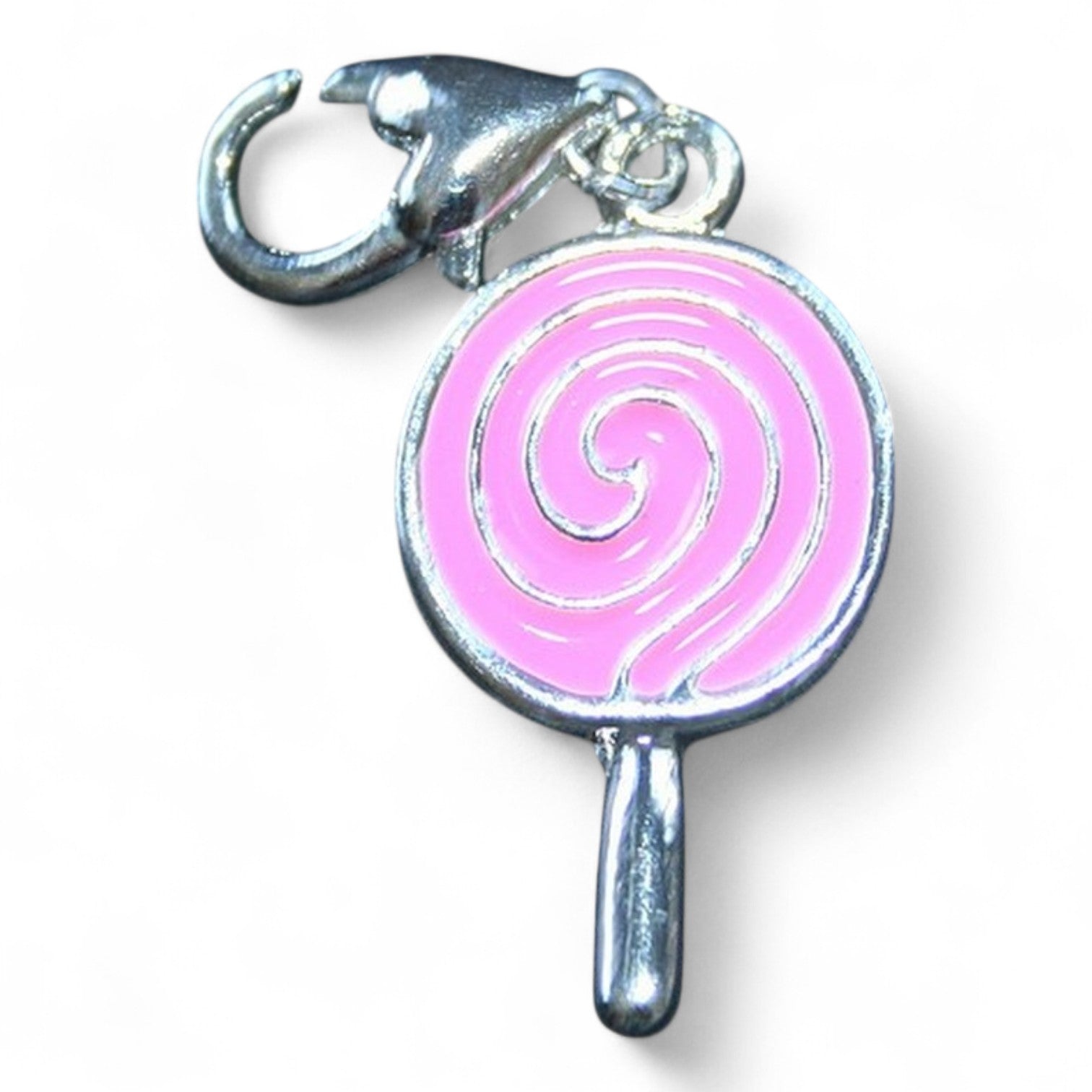 Ce charm en métal argenté émaillé représente une grande sucette rose, irrésistiblement mignonne et originale. À clipser partout !