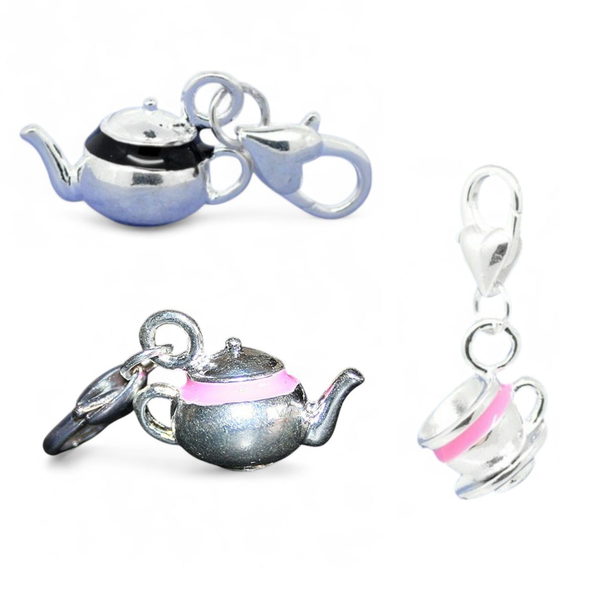 🫖 Breloques Théière et tasse Émaillée – Noir ou Rose – Métal Argenté 3D avec Fermoir (29 mm)
