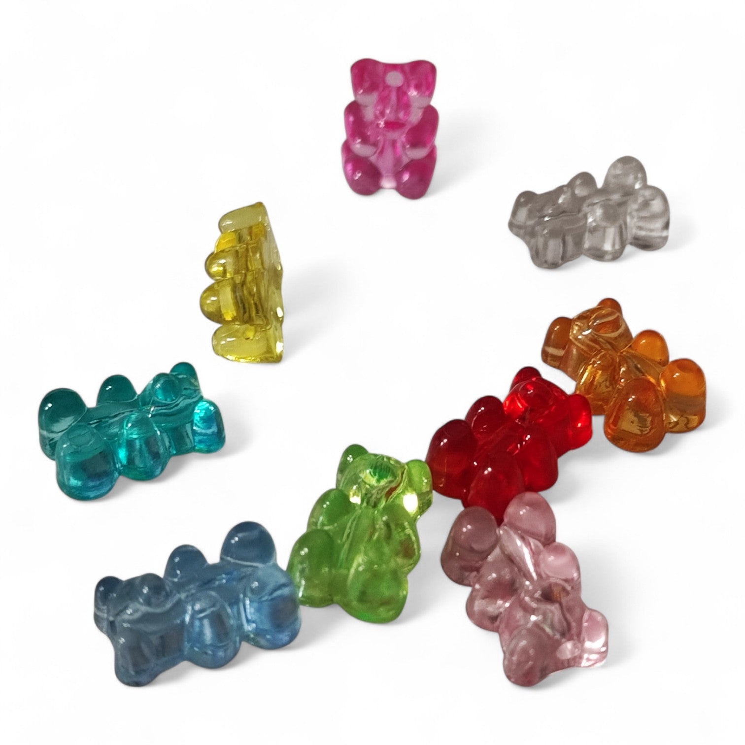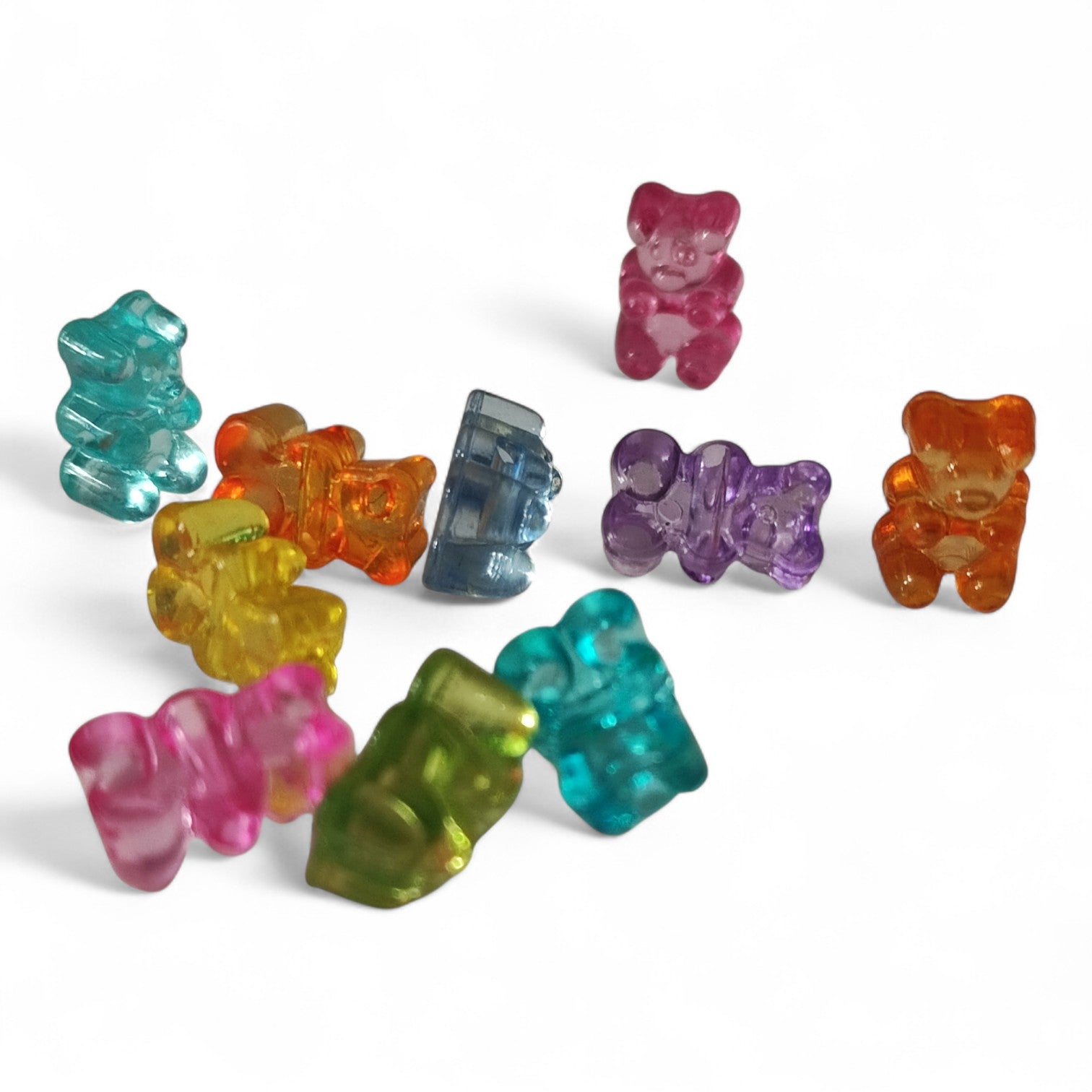 Ces perles en acrylique en forme de nounours façon bonbons Haribo apportent une touche gourmande et joyeuse à toutes tes créations. Multicolores, transparentes et éclatantes, elles brillent comme des friandises acidulées prêtes à croquer… mais attention, elles sont réservées à la création de bijoux !