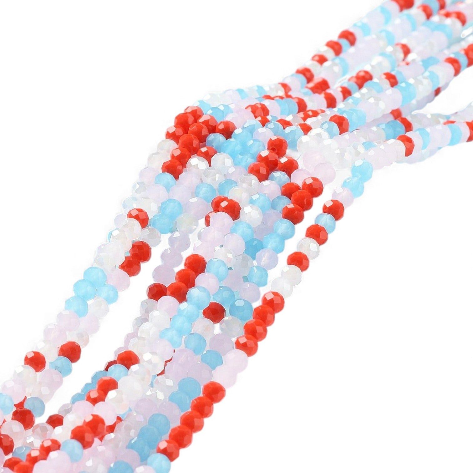Fil de perles rondelles en verre à facettes 4×3 mm, teinte Bleu/rouge/rose, environ 123–127 perles. Idéal pour bijoux fins et étincelants.