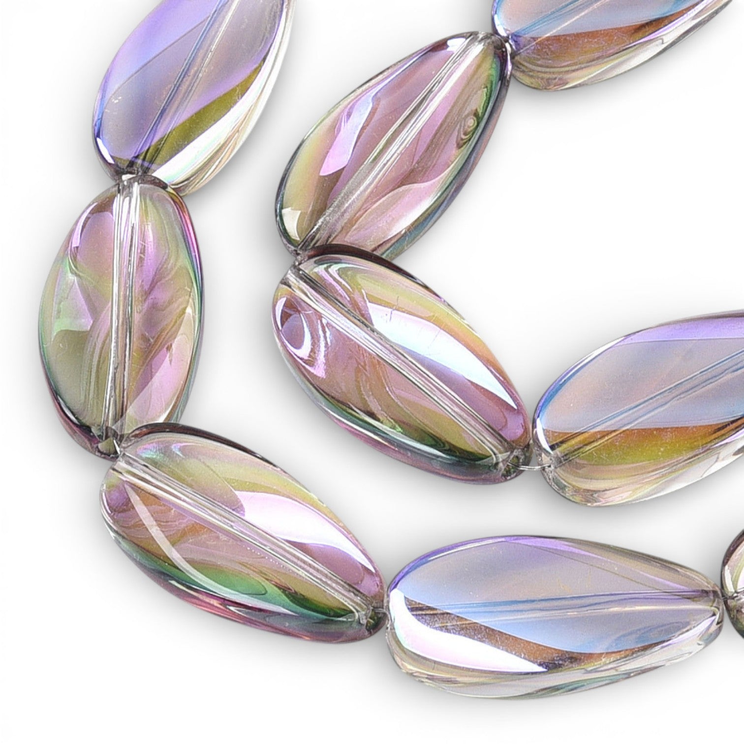 Apportez du caractère à vos bijoux avec ces magnifiques perles de verre transparentes électroplaquées en forme ovale torsadée. Leur silhouette travaillée et leur finition brillante créent un effet de mouvement et captent la lumière sous tous les angles.