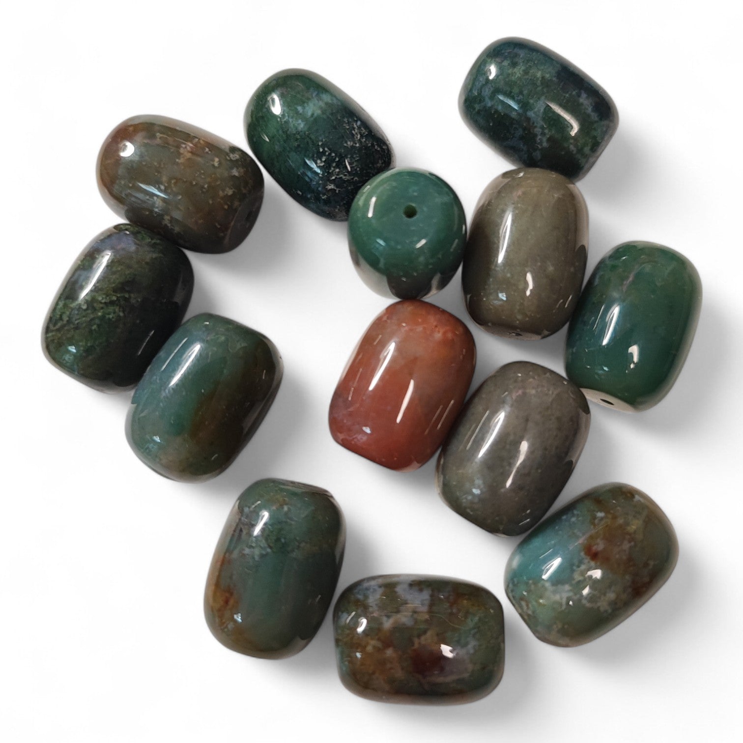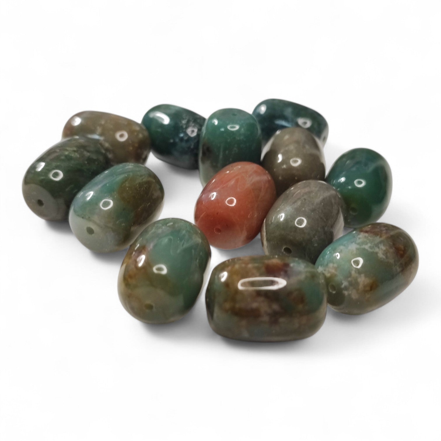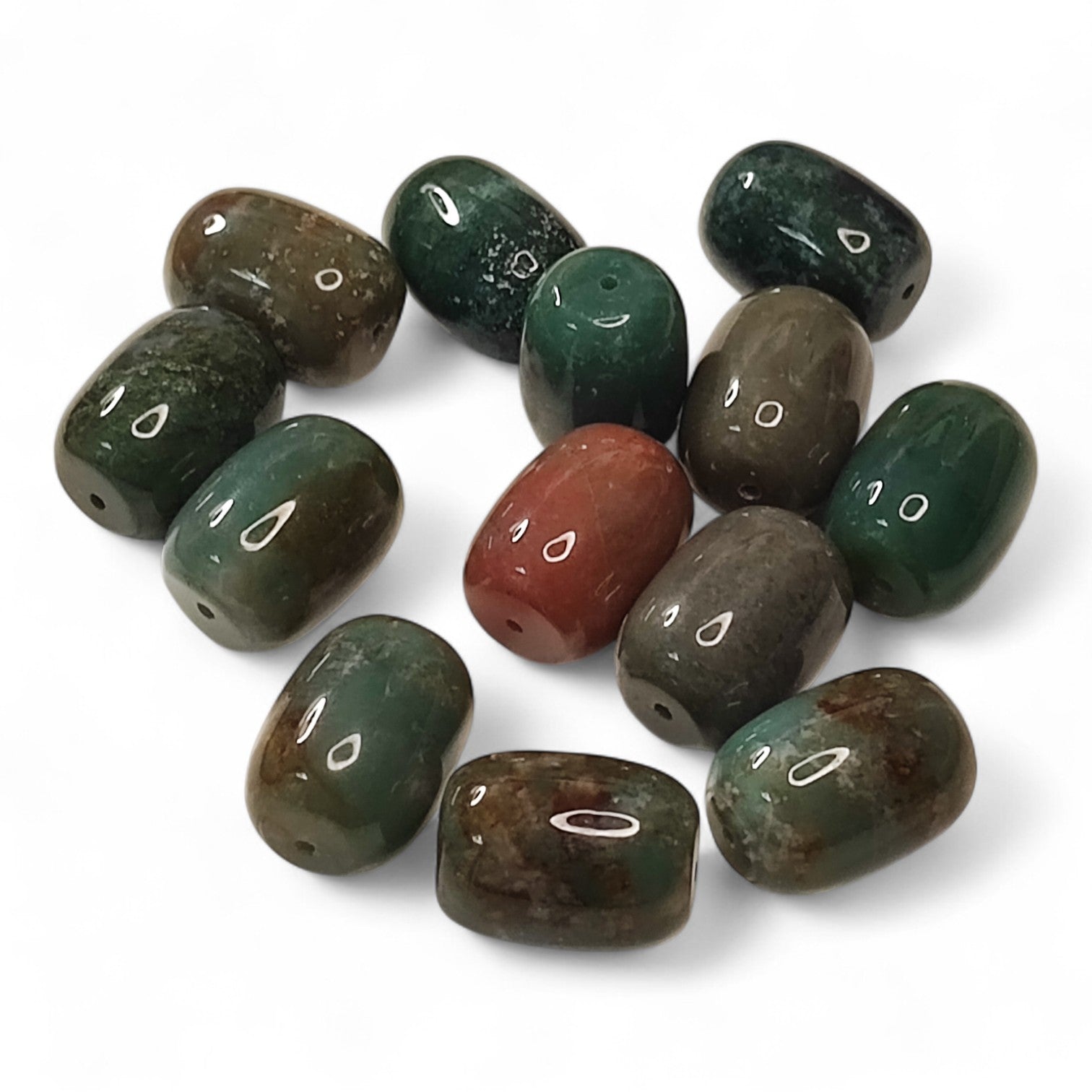Perle naturelle en agate des Indes, forme baril 20x15 mm. Chaque pièce est unique, avec des teintes riches allant du vert au brun.