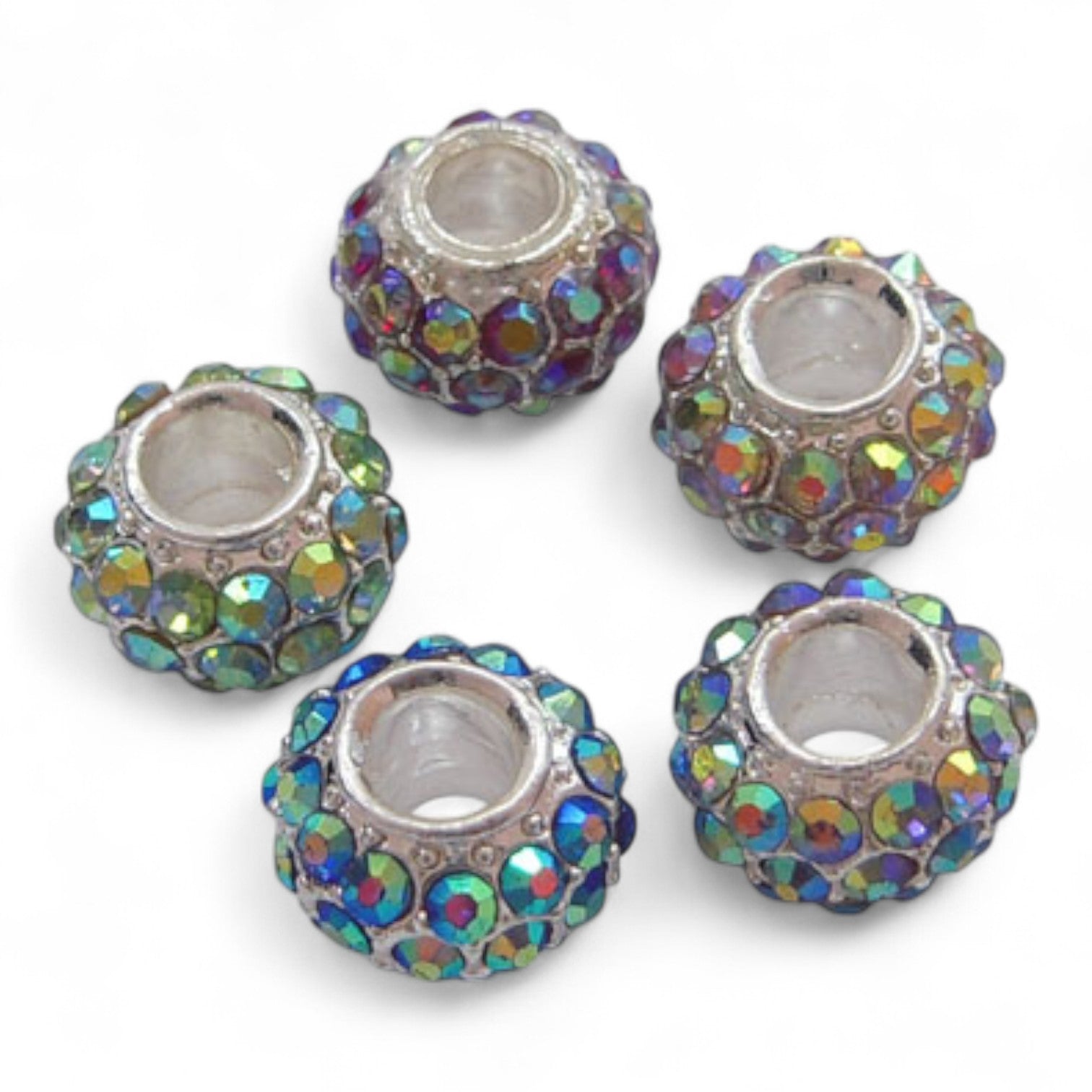Faites briller vos créations avec ces superbes perles européennes en verre, incrustées de strass scintillants aux reflets aurore boréale. Une touche de glamour pour vos bijoux modulables.