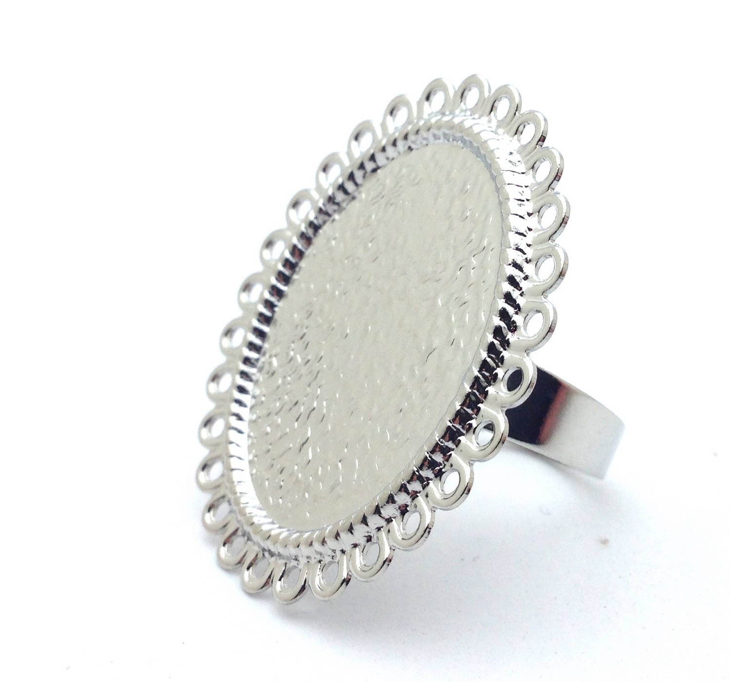Ce support de bague en cuivre argenté, orné d’un joli tour décoré, est idéal pour mettre en valeur vos cabochons de 18x25 mm. Sa base plate offre une surface de collage parfaite pour des créations solides et durables.