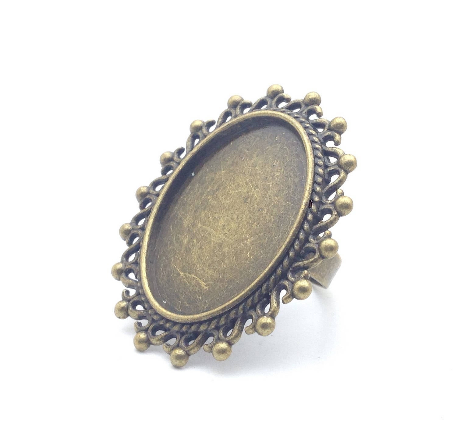 Ce support de bague en cuivre bronze, orné d’un tour décoré, est parfait pour accueillir vos cabochons de 18x25 mm. Sa finition chaleureuse et son design raffiné apporteront une touche rétro à vos créations.