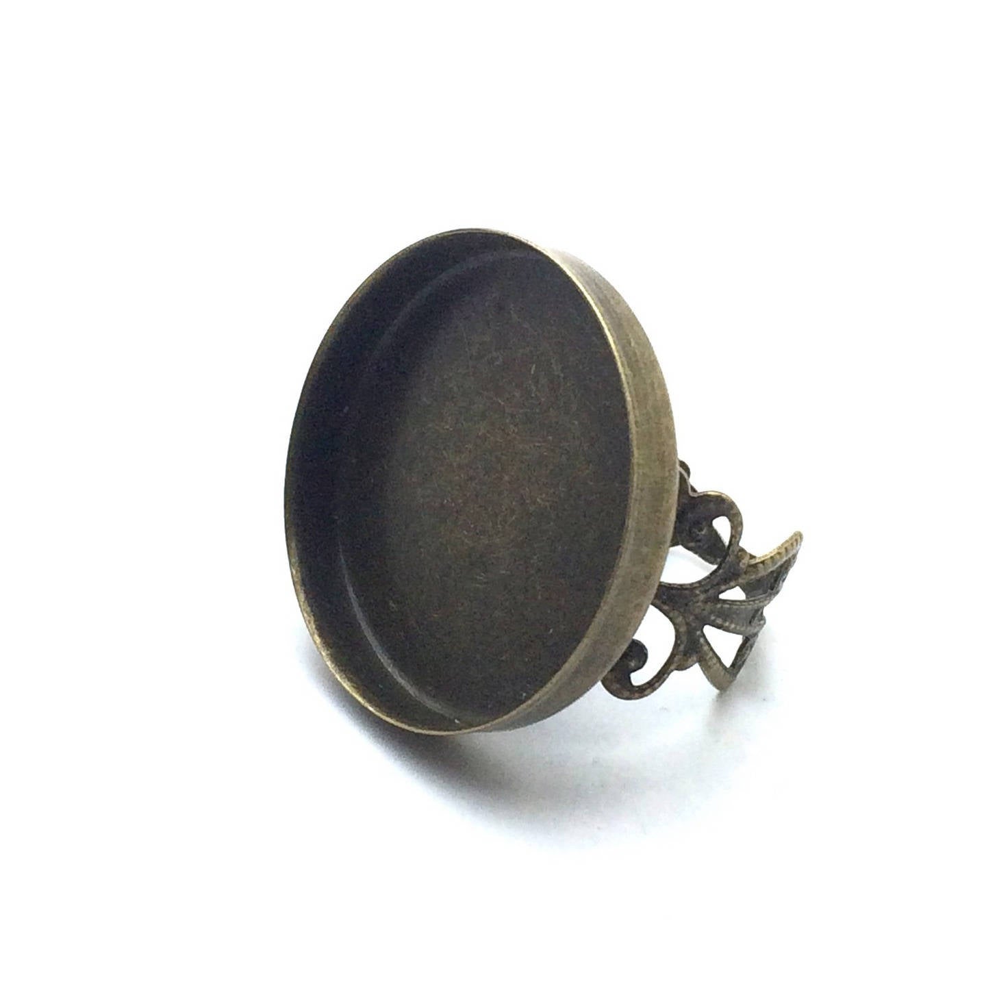 Ce support de bague en cuivre couleur bronze, avec son anneau filigrané et son large plateau de 25 mm, est parfait pour accueillir vos cabochons et donner vie à des bijoux élégants et personnalisés.